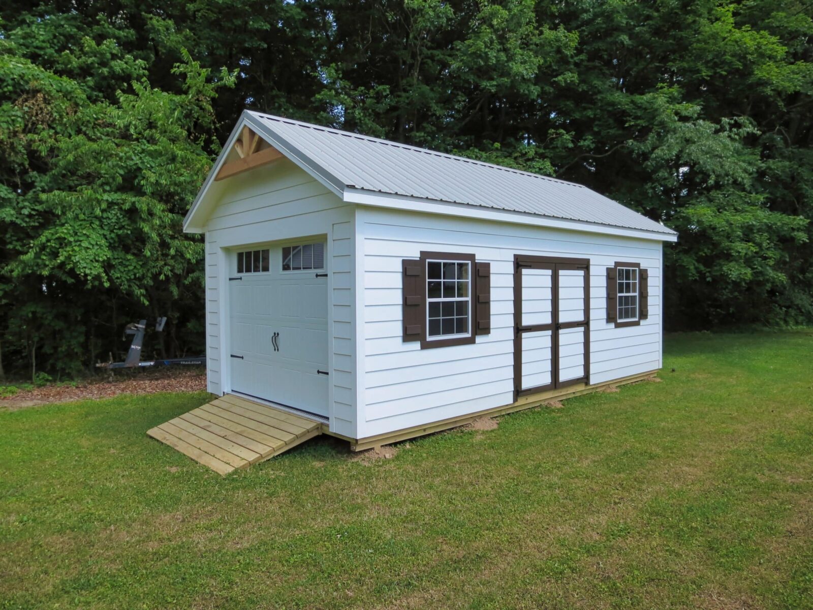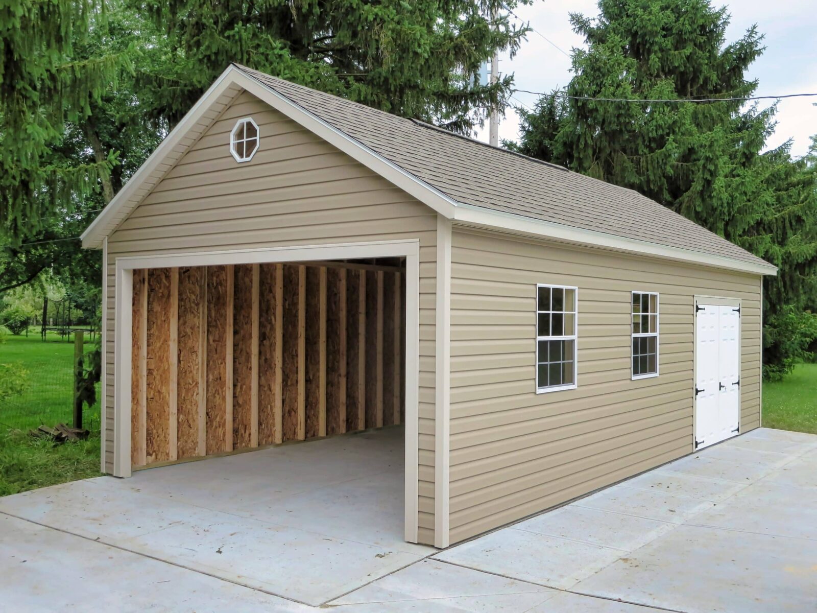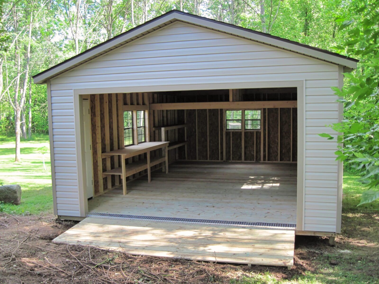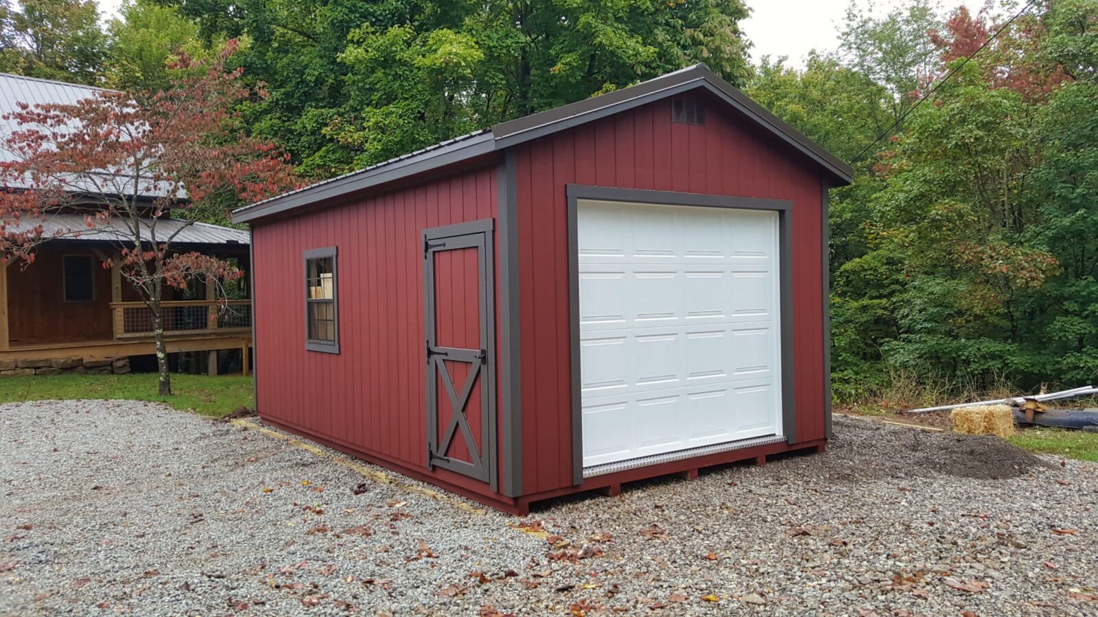 These prefab garages are ideal for an indoor parking spot or for a large workshop. Featuring the A-Frame design of our gable sheds, these sheds have hefty floors made from 2×8 treated boards. This allows you to park heavy equipment inside and know that your garage will hold up. These prefab garages can be pre-built and delivered or built on-site. As with all of our buildings, the garage can also be built on your concrete pad if you want a concrete floor.