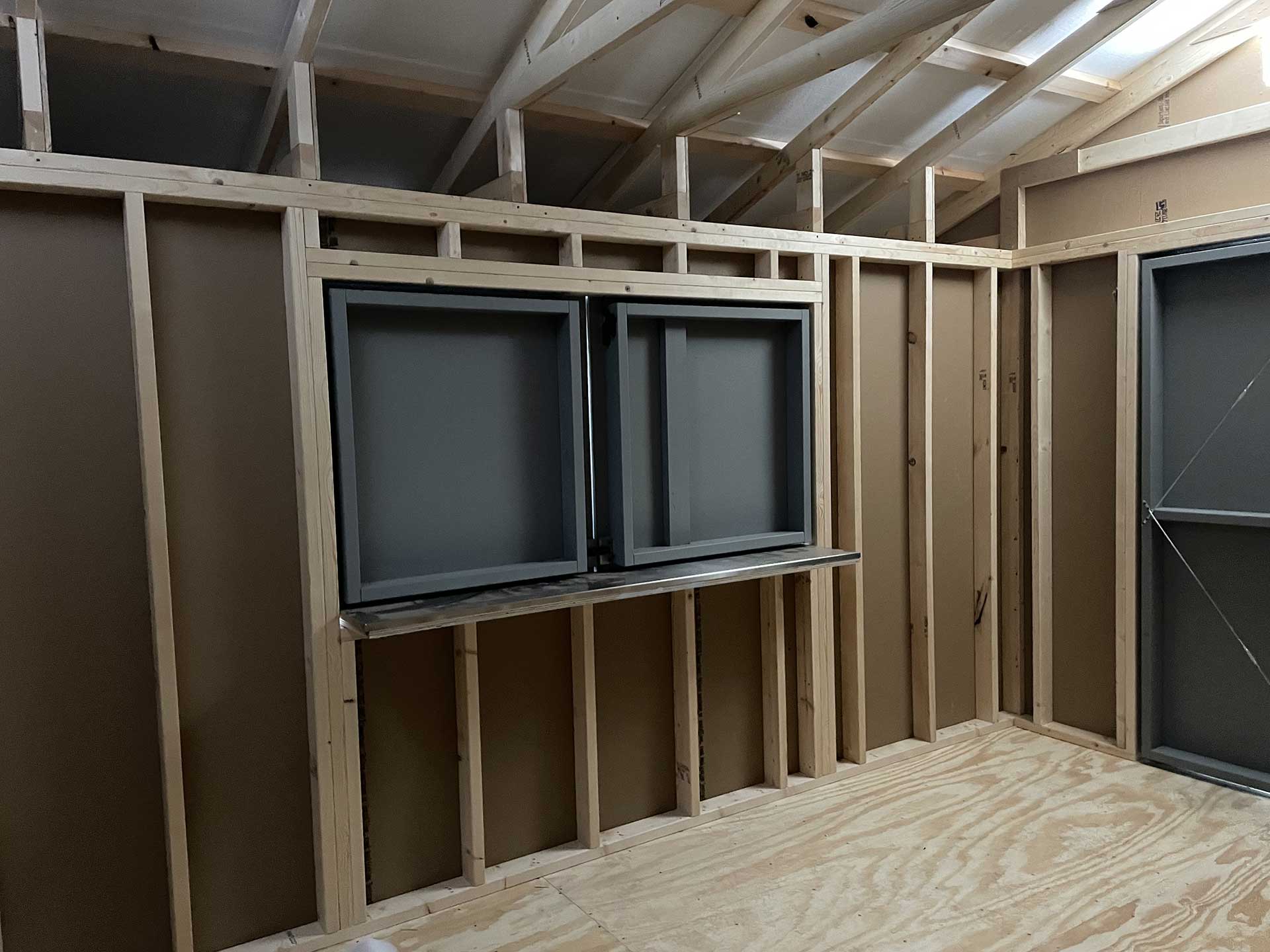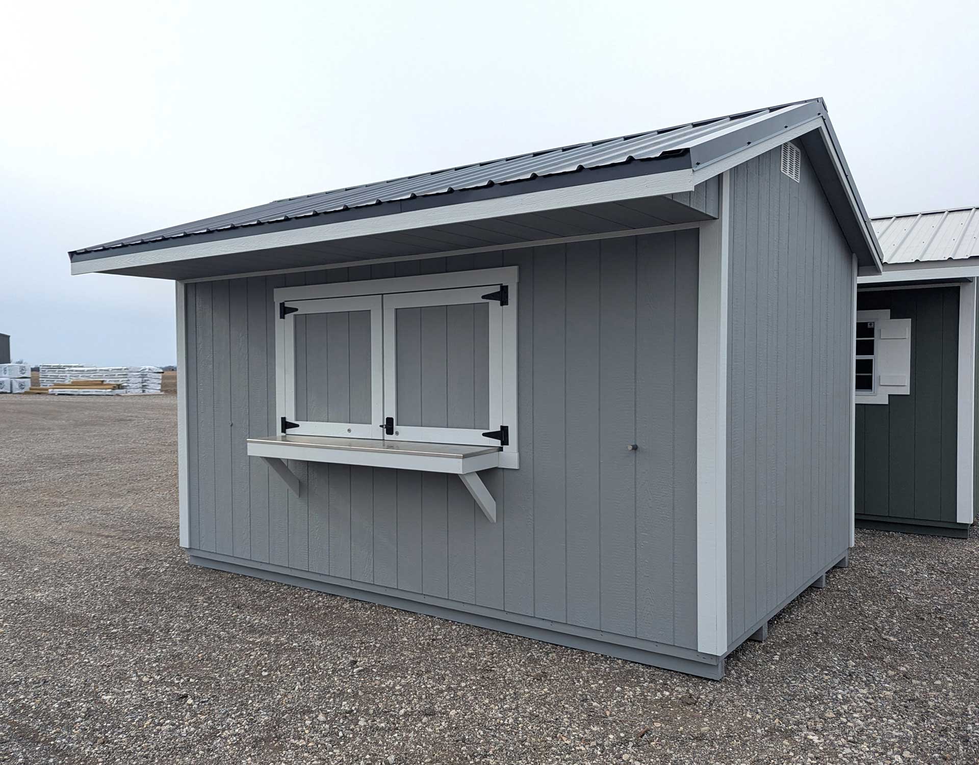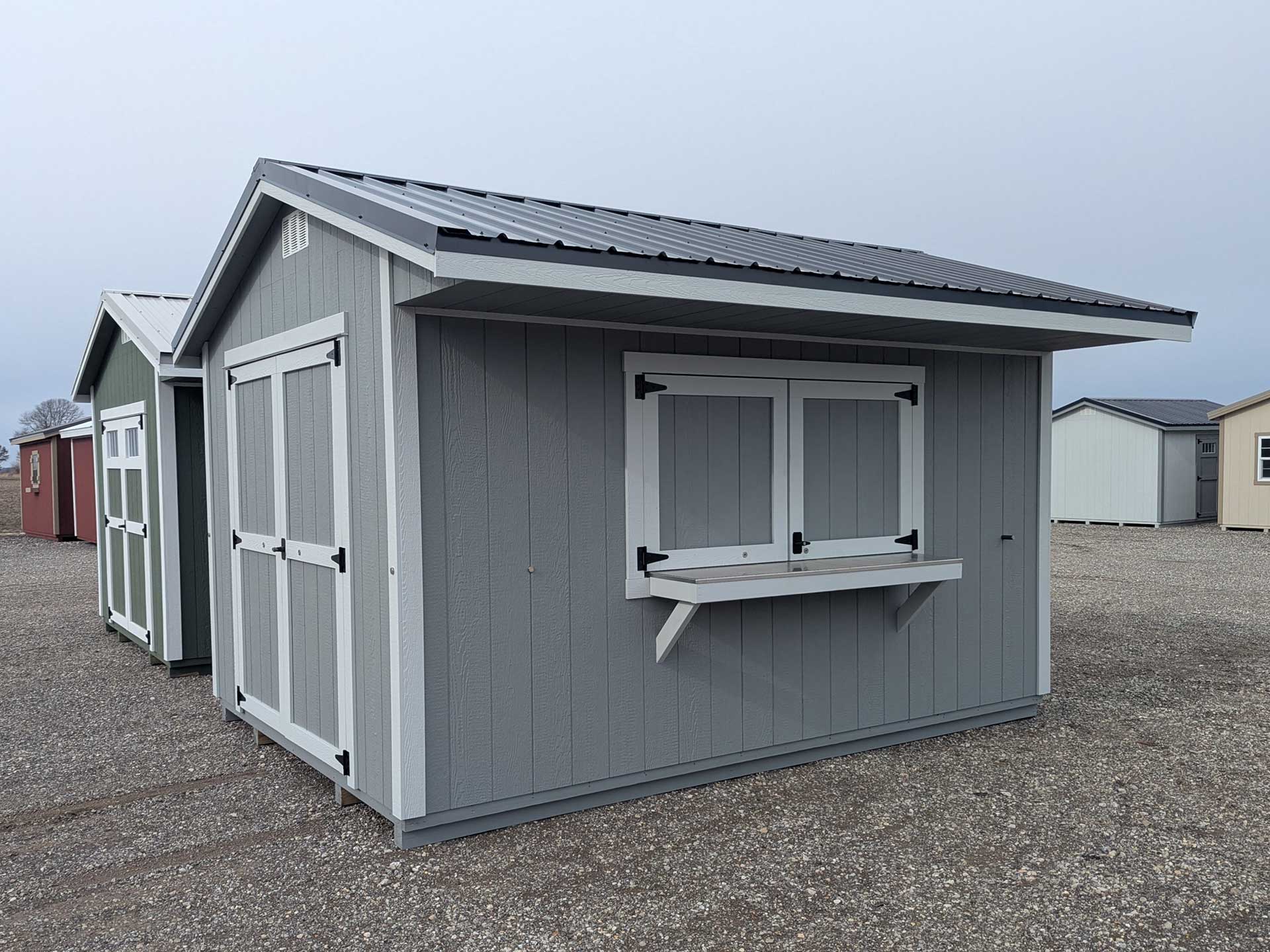Turn your backyard or campsite into the ultimate hangout with this charming Quaker-style shed. With a 32″ overhang and stainless steel bar counter, this shed is designed to be as functional as it is fun. It also features 78″ tall double doors to allow for golf cart storage.
