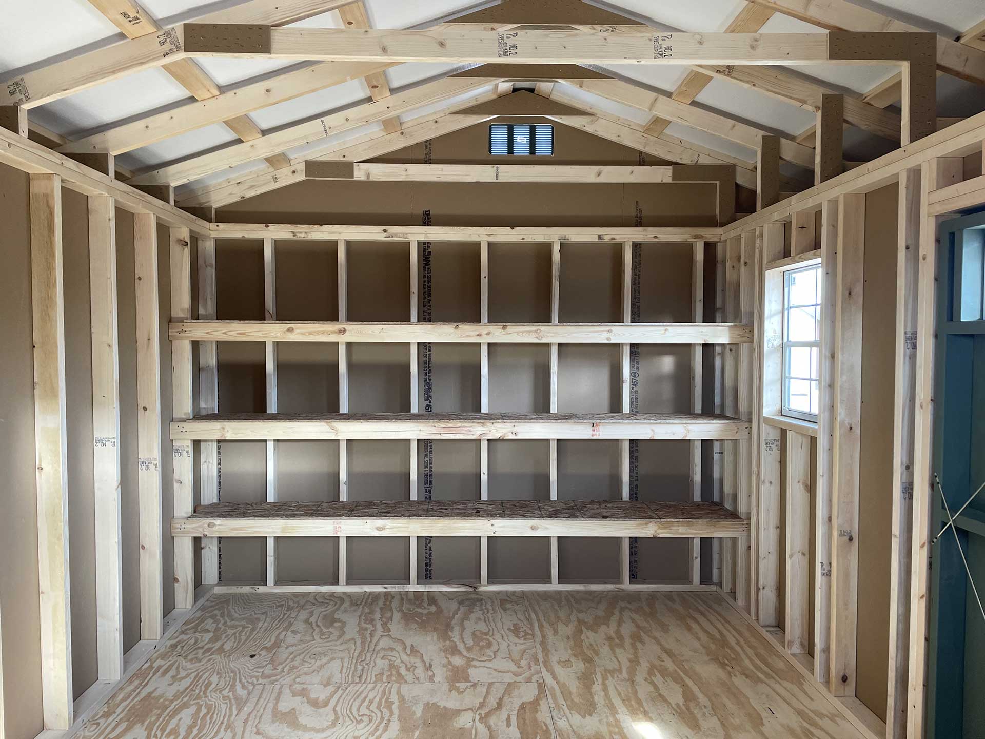 This Quaker-style shed blends classic charm with thoughtful functionality, making it the perfect solution for homeowners who enjoy organization as well as beauty. Its signature asymmetrical roof and generous 32″ overhang not only add visual interest but also provide extra weather protection and shade at the entry. Designed with organization in mind, this shed includes 16″x10′ built-in shelves, offering convenient storage to keep the area clutter-free.